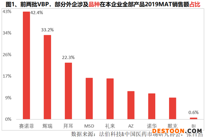 據(jù)法伯科技&中國醫(yī)藥市場研究協(xié)會的聯(lián)合報(bào)告分析,外企受前兩批VBP影響面還是很廣的,其中,受影響最大的外企是賽諾菲,其相關(guān)產(chǎn)品在賽諾菲全部產(chǎn)品的銷售占比高達(dá)42.4%,位居其后的依次是輝瑞33.2%、拜耳22.3%,其中,賽諾菲涉及的4個產(chǎn)品分別是波立維(即氯吡格雷,占29.9%)、安博維(即厄貝沙坦,占5.3%)、亞莫利(即格列美脲,占4.3%)和安博諾(即厄貝沙坦氫氯噻嗪,占2.9%)。(圖1)