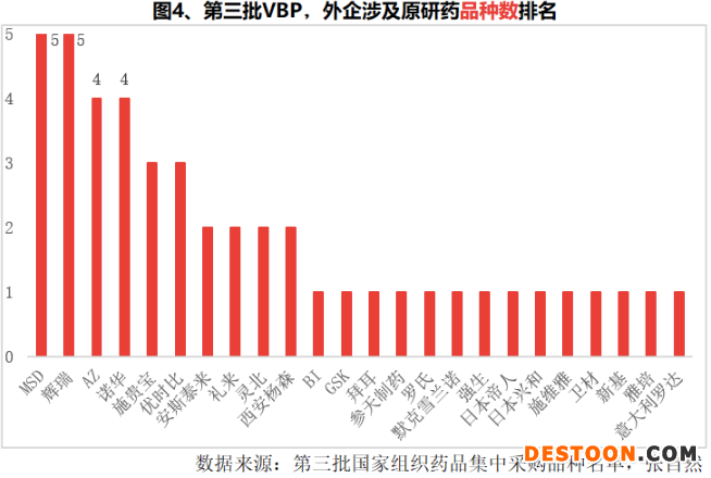 經(jīng)進(jìn)一步核實(shí),第三批VBP共涉及24家外企,其中,涉及原研品種數(shù)量最多的是默沙東(簡稱MSD)和輝瑞,各有5個品種,分別是默沙東的非那雄胺、依托考昔、地氯雷他定3個常釋劑型和孟魯司特顆粒劑及孟魯司特咀嚼片,輝瑞的舍曲林 、塞來昔布、托法替布、利奈唑胺4個口服常釋劑型及非醫(yī)保的枸櫞酸西地那非片。(圖4)
