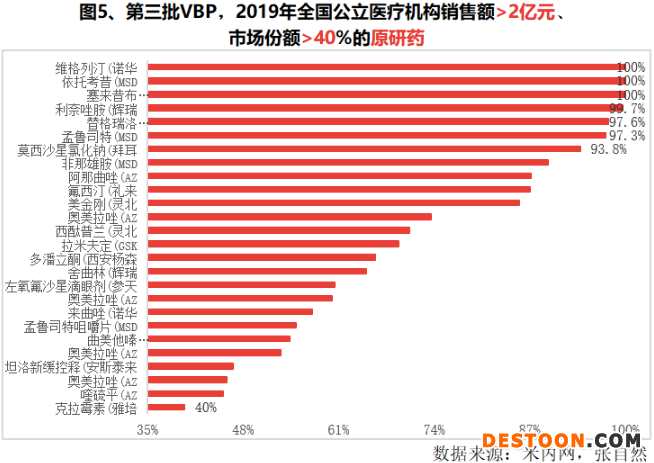 盡管專利已過期,但外企原研藥在國內(nèi)市場一致占有較大市場份額,這也是國家啟動VBP的原因之一,第三批VBP涉及的原研產(chǎn)品也不例外,圖5列舉了第三批VBP涉及的2019年全國公立醫(yī)療機(jī)構(gòu)銷售額>2億元、市場份額>40%的部分原研藥,其中,塞來昔布(輝瑞)、依托考昔(MSD)、維格列汀(諾華)仍由原研占領(lǐng)全部市場,其2019年全國公立醫(yī)療機(jī)構(gòu)的銷售額分別是10.7億元、4.15億元和2.44億元。