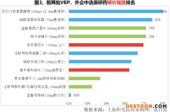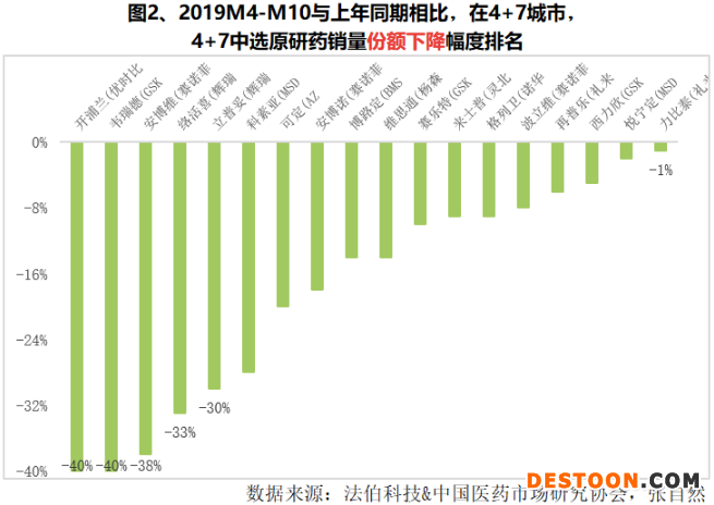 據(jù)法伯科技&中國醫(yī)藥市場研究協(xié)會的聯(lián)合報(bào)告分析,在4+7試點(diǎn)城市,非中標(biāo)原研產(chǎn)品在相應(yīng)品種中的銷量和銷售額占比全面下降,銷量份額降到平均20%左右。其中,銷量份額下降幅度最大的是優(yōu)時比的開浦蘭(左乙拉西坦)和GSK的韋瑞德(替諾福韋二吡呋酯),降幅高達(dá)40%,其后依次是安博維(即厄貝沙坦,賽諾菲)38%、絡(luò)活喜(即氨氯地平,輝瑞)33%和立普妥(即阿托伐他汀,輝瑞)30%。(圖2)