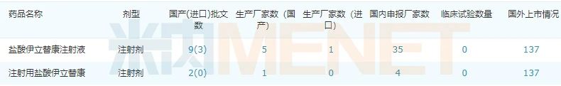 伊立替康注射劑適用于晚期大腸癌患者的治療,米內(nèi)網(wǎng)數(shù)據(jù)顯示,2019年在中國公立醫(yī)院、縣級(jí)公立醫(yī)院、城市社區(qū)中心及鄉(xiāng)鎮(zhèn)衛(wèi)生院(簡稱中國公立醫(yī)療機(jī)構(gòu))終端伊立替康的銷售額達(dá)18億元,目前已上市的產(chǎn)品包括了,鹽酸伊立替康注射液、注射用伊立替康,其中鹽酸伊立替康注射液的競爭企業(yè)有6家。