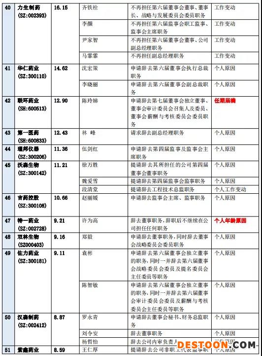 其中尤以復星醫(yī)藥的副總裁職務和東北制藥的副總經(jīng)理職務變動最為頻繁——據(jù)不完全統(tǒng)計,半年間,復星醫(yī)藥的5位高管接連離職;東北制藥的副總經(jīng)理職務也任期短暫,2月份,路永強被東北制藥董事會解聘副總經(jīng)理職務;4月份,鄭長勝、王浩淼先后因個人原因申請辭去東北制藥副總經(jīng)理職務;5月份,張利東因工作變動不再擔任東北制藥副總經(jīng)理及財務總監(jiān)職務。