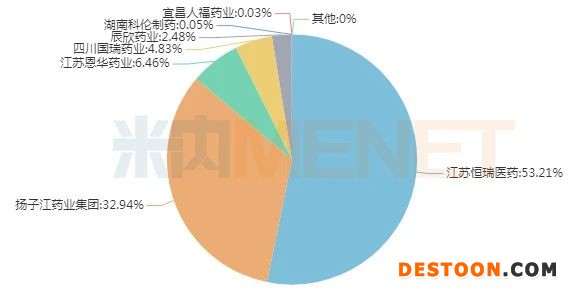 值得一提的是,2018年6月?lián)P子江的鹽酸右美托咪定注射液以3類仿制獲批上市,并視同過評,隨后獨家中標(biāo)“4+7”集采、聯(lián)盟地區(qū)集采,市場份額快速攀升,2018年不足1%,2019年則暴增超過180倍,市場份額突破30%,僅次于恒瑞醫(yī)藥。