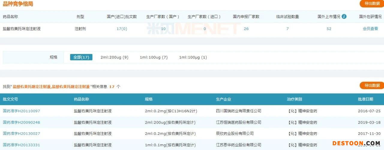 日前,CDE官網(wǎng)顯示,江蘇正大清江制藥的鹽酸右美托咪定注射液以仿制3類申報上市。米內(nèi)網(wǎng)數(shù)據(jù)顯示,2019年中國公立醫(yī)療機(jī)構(gòu)終端右美托咪定注射劑銷售額超過30億元。目前,國內(nèi)生產(chǎn)企業(yè)有恒瑞醫(yī)藥、揚子江藥業(yè)、辰欣藥業(yè)、恩華藥業(yè)、湖南科倫制藥等10家。一致性評價方面,僅有揚子江藥業(yè)一家過評。