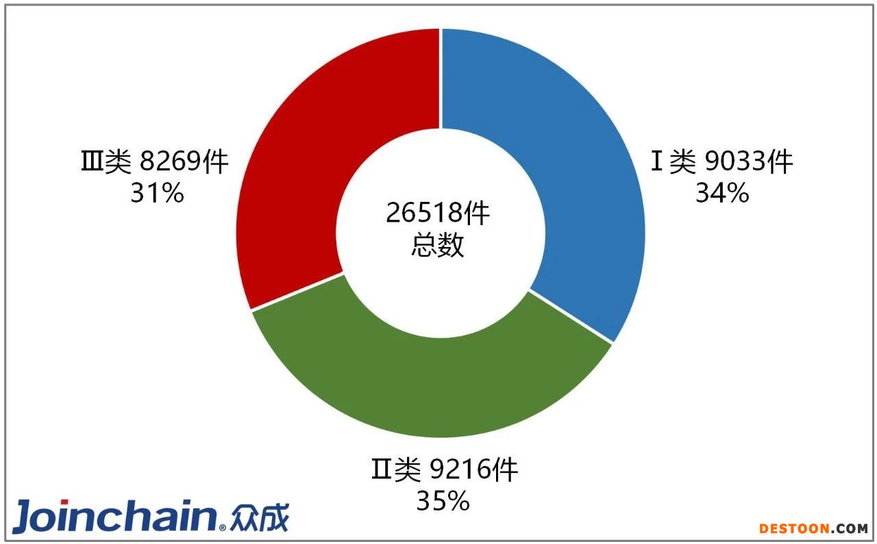 從進(jìn)口產(chǎn)品類型及數(shù)量分布看,Ⅰ類9033件,Ⅱ類9216件,Ⅲ類8269件。