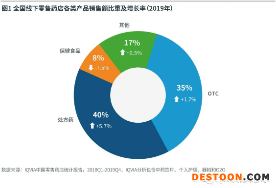 如果再加上中藥飲片、個(gè)人護(hù)理和器械,則2019年線下零售藥店整體規(guī)模約為3711億元。值得一提的是,受醫(yī)保政策限制非藥品類在藥店銷售和帶量采購政策推行、處方外流的影響,第二終端的藥品銷售占比持續(xù)提升——OTC和處方藥占據(jù)線下藥店整體市場的75%。(參見圖1)