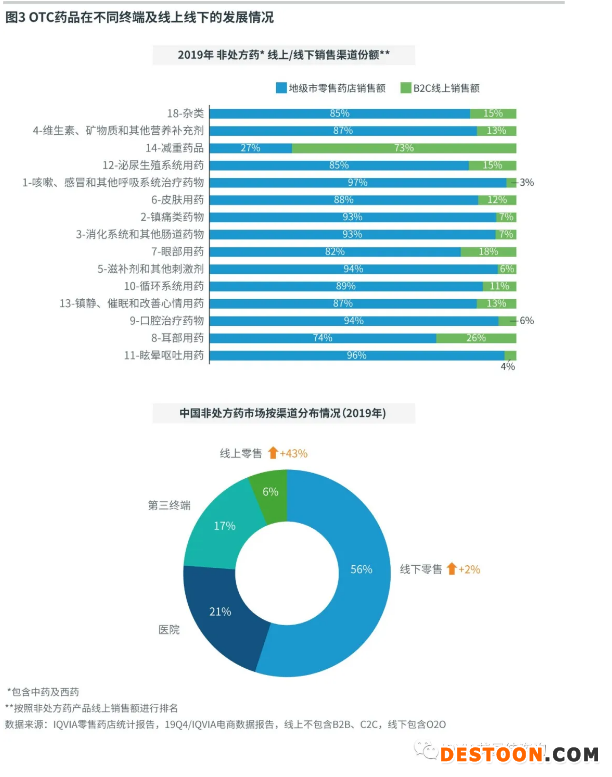 IQVIA數(shù)據(jù)顯示,2019年中國醫(yī)藥健康市場(只含各終端銷售的藥品和零售藥店銷售的保健品,含線上渠道但不包含中藥飲片、個(gè)人護(hù)理和器械)的整體規(guī)模為15,563億元。其中,處方藥占79.6%的市場份額,OTC占15%,保健品占5.4%。分渠道來看,醫(yī)療終端占75%, 包含醫(yī)藥電商的零售終端占25%;其中醫(yī)藥電商渠道占比5%,但發(fā)展迅猛。