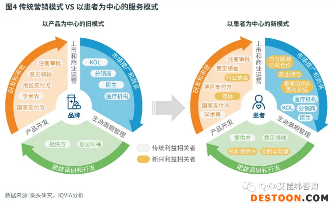 當(dāng)然,無論政策和環(huán)境發(fā)生怎樣的變化,零售渠道都將成為醫(yī)藥分業(yè)的最終受益者,但這個(gè)渠道紅利需要配合服務(wù)模式的轉(zhuǎn)變——傳統(tǒng)的營銷模式已經(jīng)不能滿足市場需求,未來以患者為中心的服務(wù)模式將成為主流,特別是疫情之下凸顯了互聯(lián)網(wǎng)診療帶來的藥品零售新機(jī)會(huì)。零售企業(yè)應(yīng)主動(dòng)參與提升數(shù)字化的患者管理和服務(wù)能力。未來,醫(yī)藥零售的生意模式將是數(shù)據(jù)驅(qū)動(dòng)的線上線下融合,批發(fā)、零售和互聯(lián)網(wǎng)平臺(tái)的界限將被打通,并出現(xiàn)依托大連鎖或大平臺(tái)的數(shù)字商業(yè)體。(參見圖3、4)