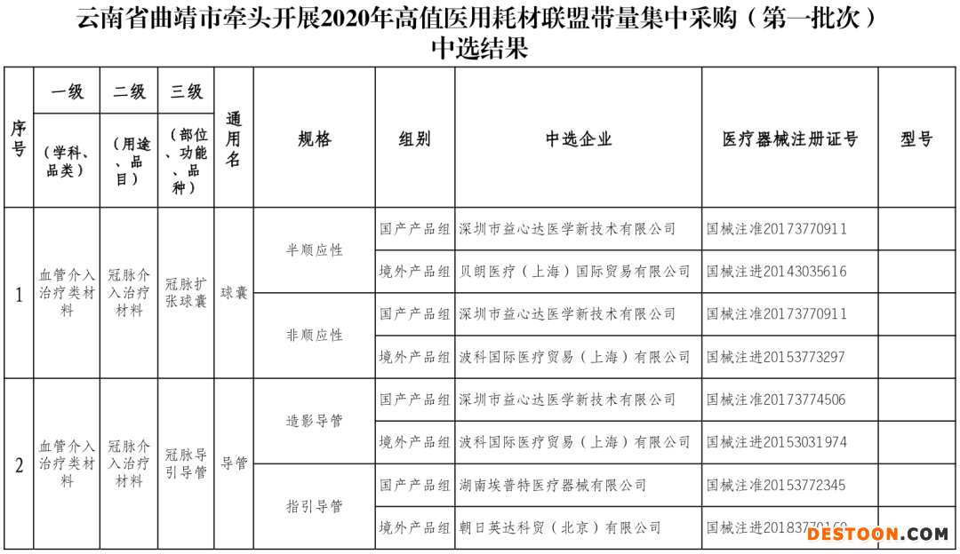 7月23日,云南省曲靖市牽頭開展2020年第一批公立醫(yī)療機構(gòu)高值醫(yī)用耗材聯(lián)盟帶量集中采購(第一批次)中選結(jié)果公布。