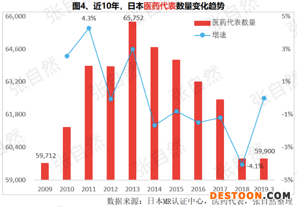 6月5日,《醫(yī)藥代表備案管理辦法(試行)》(征求意見稿)發(fā)布,這是繼2017年12月22日后的又一次征求意見,也是對2017年國辦13號文和中辦國辦42號文的進一步貫徹,并明確提出醫(yī)藥代表不得承擔藥品銷售任務、不得收款和處理購銷票據(jù)及不得統(tǒng)方等,對醫(yī)藥代表影響巨大。以日本為例,2013年醫(yī)藥代表數(shù)量達到峰值65752人,其后逐年遞減,到去年3月只有59900人,減少了5800多人(圖4)。