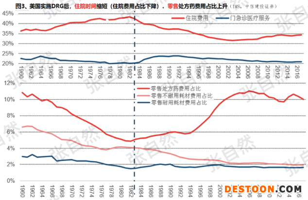 據(jù)美國經驗,實施DRG后患者平均住院時間縮短、住院費用占比下降,相應的零售處方藥費用占比上升(圖3)。