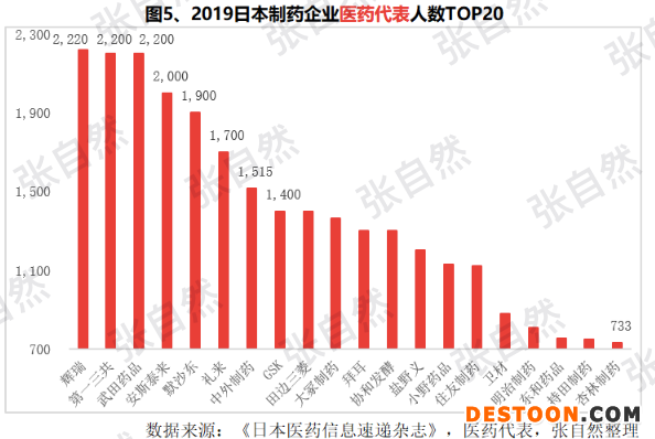 2019年,在日本以輝瑞的醫(yī)藥代表數(shù)量最多,為2220人,在醫(yī)藥代表TOP20企業(yè)中,日本本土企業(yè)居多,只有5家外企(輝瑞、默沙東、禮來、GSK、拜耳)(圖5)。
