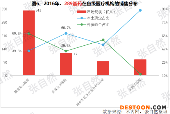 實際上,早在2019年10月11日國務院辦公廳發(fā)布的《關于進一步做好短缺藥品保供穩(wěn)價工作的意見》就要求促進基本藥物優(yōu)先配備使用,提升基本藥物使用占比,逐步實現(xiàn)政府辦基層醫(yī)療衛(wèi)生機構、二級公立醫(yī)院、三級公立醫(yī)院基本藥物配備品種數(shù)量占比原則上分別不低于90%、80%、60%(簡稱986),推動各級醫(yī)療機構形成以基本藥物為主導的“1+X”(“1”為國家基本藥物目錄、“X”為非基本藥物,由各地根據(jù)實際確定)用藥模式,基藥市場又將擴容,以289基藥為例,2016年全國公立醫(yī)療機構共銷售614億元,其中在城市公立醫(yī)院銷售341億元(占55%),其次是縣級公立醫(yī)院銷售117億元,另外,就企業(yè)性質而言,越往基層,本土藥企占比越高,如在鄉(xiāng)鎮(zhèn)衛(wèi)生院,本土藥企占了88%(圖6)。
