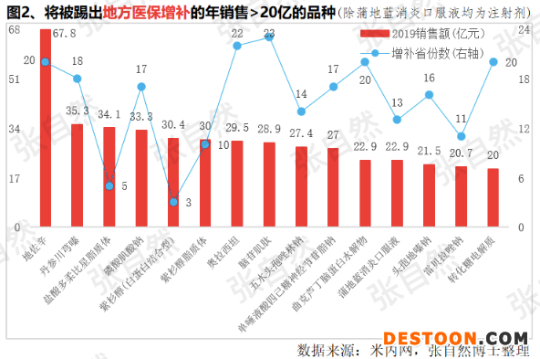 隨著2019年版國家醫(yī)保藥品目錄在各地的陸續(xù)實施,各省相繼調整省增補及重點監(jiān)控藥品,并按4:4:2的節(jié)奏分3年全部調出,今年6月底前先將國家重點監(jiān)控品種剔出,這將給行業(yè)帶來巨大影響,其中,年銷售大于20億元的品種就多達15個(圖2)。