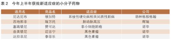 從今年上半年我國藥品審評審批情況來看,至少有16款創(chuàng)新藥產(chǎn)品獲得了新適應(yīng)癥批準(zhǔn),其中5款為小分子化藥獲批新適應(yīng)癥。如諾華的黑色素瘤聯(lián)合療法曲美替尼和達(dá)拉非尼、入局ALK陽性局部晚期或轉(zhuǎn)移性非小細(xì)胞肺癌一線治療的塞瑞替尼,以及勃林格殷格翰獲批系統(tǒng)性硬化病相關(guān)間質(zhì)性肺病(SSc-ILD)治療的尼達(dá)尼布。此外,還有輝瑞的西地那非獲批新適應(yīng)癥——治療肺動(dòng)脈高壓(詳見表2)。
