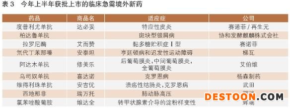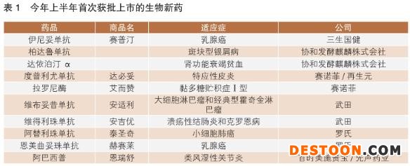 在今年上半年批準(zhǔn)的39款新藥中,21款為生物制劑(包括16款抗體藥物),18款為小分子化藥。按首次批準(zhǔn)計(jì)算,上半年批準(zhǔn)了10款生物藥,多為進(jìn)口產(chǎn)品。武田、羅氏、賽諾菲和協(xié)和發(fā)酵麒麟株式會社各有2款生物藥獲批(詳見表1)。