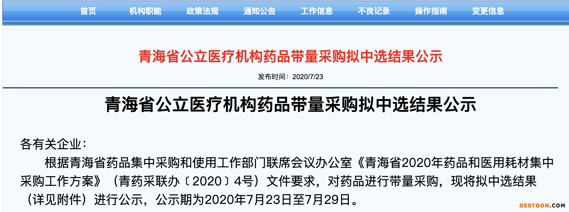 根據(jù)青海省藥品集中采購和使用工作部門聯(lián)席會議辦公室《青海省2020年藥品和醫(yī)用耗材集中采購工作方案》(青藥采聯(lián)辦﹝2020﹞4號)文件要求,對59個藥品進(jìn)行帶量采購,現(xiàn)將擬中選結(jié)果進(jìn)行公示,公示期為2020年7月23日至7月29日。