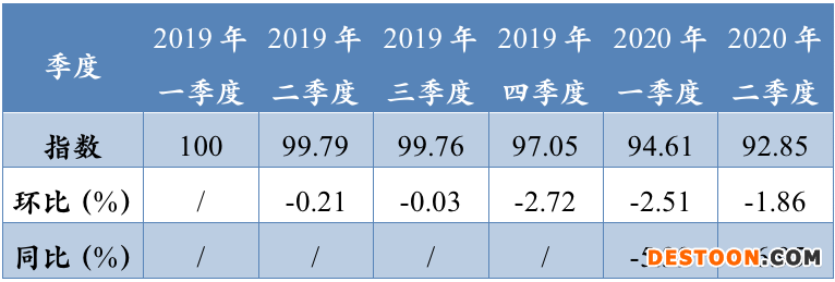 經(jīng)測算,基礎(chǔ)衛(wèi)生材料類醫(yī)用耗材2019年四季度起環(huán)比降幅分別為8.37%、4.96%和2.33%,2020年一季度和二季度同比降幅分別為13.85%和14.99%?;A(chǔ)衛(wèi)生材料類耗材整體價(jià)格下降促使二季度價(jià)格監(jiān)測指數(shù)下降1.9。
