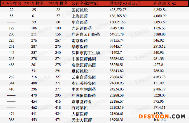 中國(guó)生物制藥從2016年的410名提升至377名。恒瑞和石藥集團(tuán)則是500強(qiáng)的新秀,兩者均是2019年入圍。恒瑞2019年入圍時(shí)排名為470,2020年排名迅速攀升54位,達(dá)416名。石藥集團(tuán)2019年入圍時(shí)排名為462名,今年已經(jīng)躍居至418名,排名上升44位。