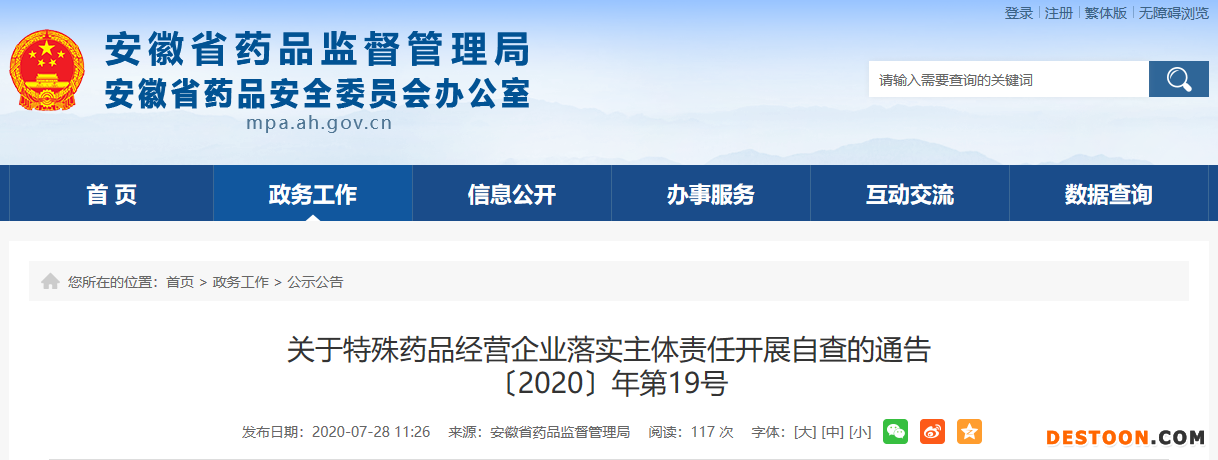 7月28日,安徽省藥監(jiān)局發(fā)布了《關(guān)于特殊藥品經(jīng)營企業(yè)落實主體責(zé)任開展自查的通告〔2020〕年第19號》(以下簡稱《自查通告》)。