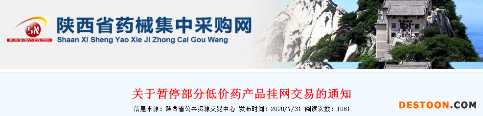 醫(yī)藥網(wǎng)8月4日訊 日前,陜西省公共資源交易中心官網(wǎng)發(fā)布通知,根據(jù)省采購平臺(tái)網(wǎng)采結(jié)果和低價(jià)藥品日均費(fèi)用標(biāo)準(zhǔn)的要求,有部分低價(jià)藥產(chǎn)品醫(yī)療機(jī)構(gòu)實(shí)際采購價(jià)格超出低價(jià)藥日均費(fèi)用標(biāo)準(zhǔn),現(xiàn)將超出標(biāo)準(zhǔn)產(chǎn)品暫停掛網(wǎng)。