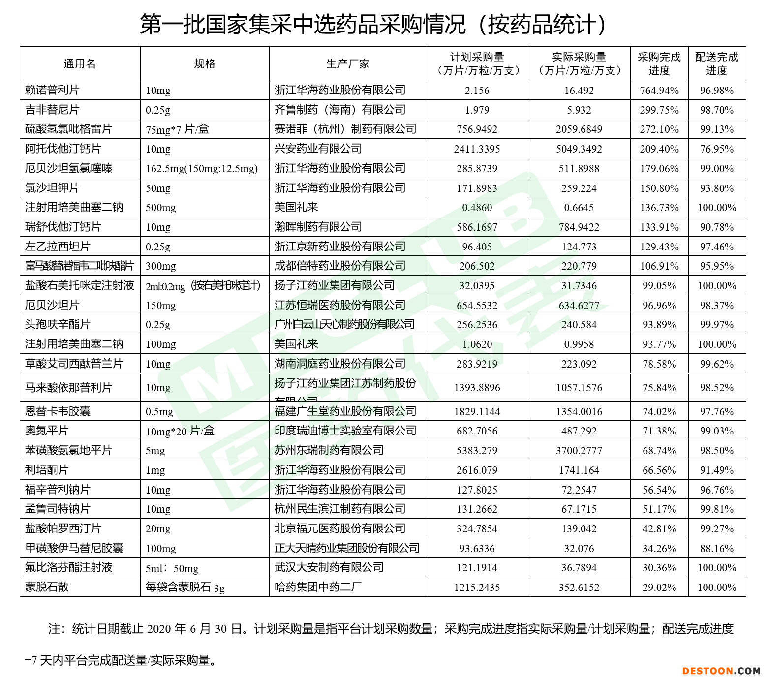 7 月 31 日,湖南省醫(yī)保局發(fā)布了截止 2020 年 6 月 30 日湖南省對(duì)于第一批國采的執(zhí)行情況,約定采購量完成情況如下: