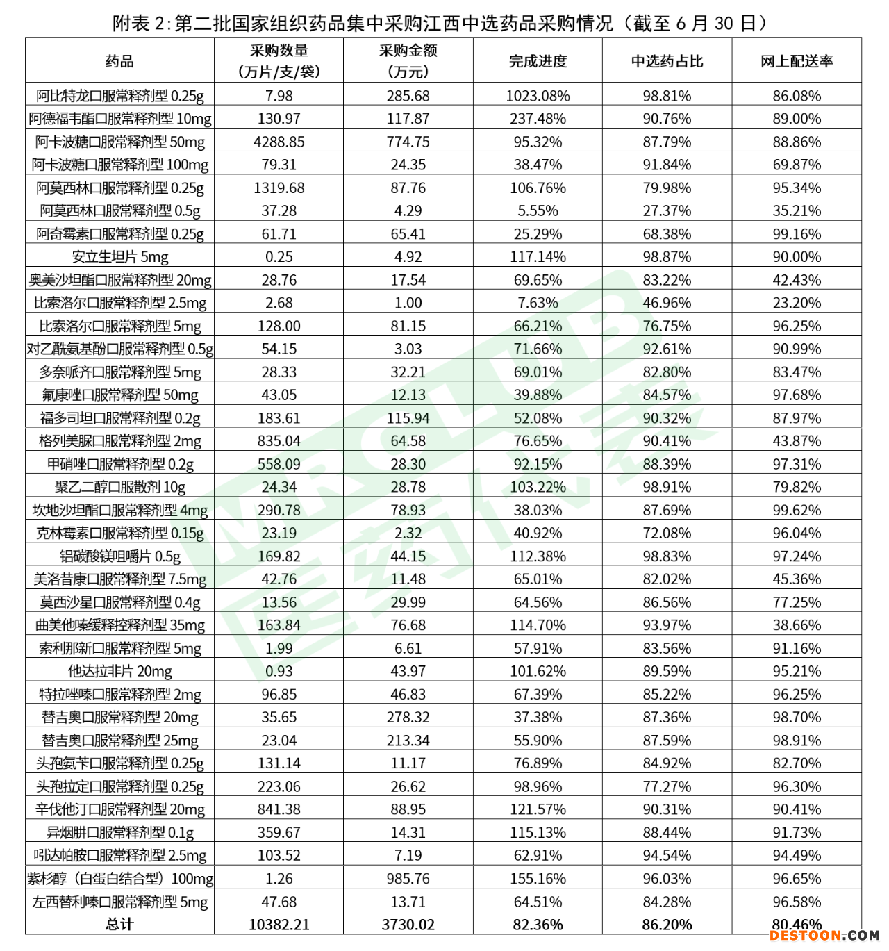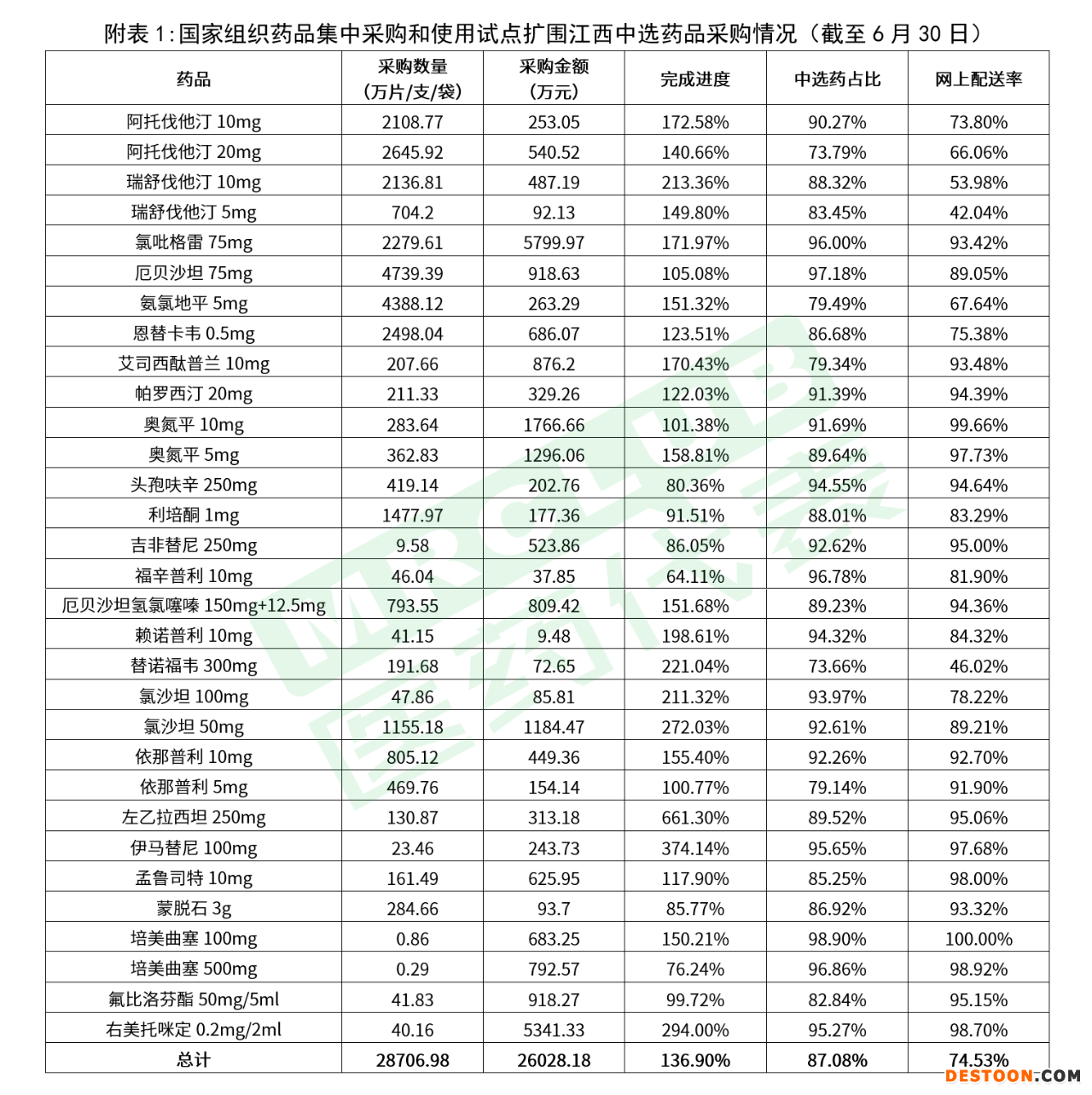 7 月 29 日,江西省通報(bào)了《江西省落實(shí)國家組織藥品集中采購和使用工作情況通報(bào)》,兩批國采結(jié)果數(shù)據(jù)截止至 6 月 30 日。