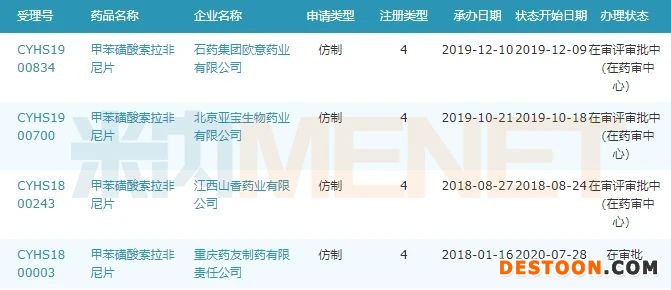 較早之前,甲苯磺酸索拉非尼片已經吸引到了一批藥企的垂青,2016年有11家藥企的6類仿制上市申請獲批臨床,其中包括了輔仁藥業(yè)集團、重慶藥友制藥、重慶圣華曦藥業(yè)、正大天晴藥業(yè)集團、山東羅欣藥業(yè)、湖南科倫制藥、石藥集團中奇制藥、齊魯制藥、江蘇豪森藥業(yè)等。重慶藥友制藥、江西山香藥業(yè)的4類仿制上市申請于2018年獲得承辦,目前重慶藥友制藥已經進入了審批流程,北京亞寶生物藥業(yè)、石藥集團歐意藥業(yè)也于2019年入局,相關受理號在審評審批中。