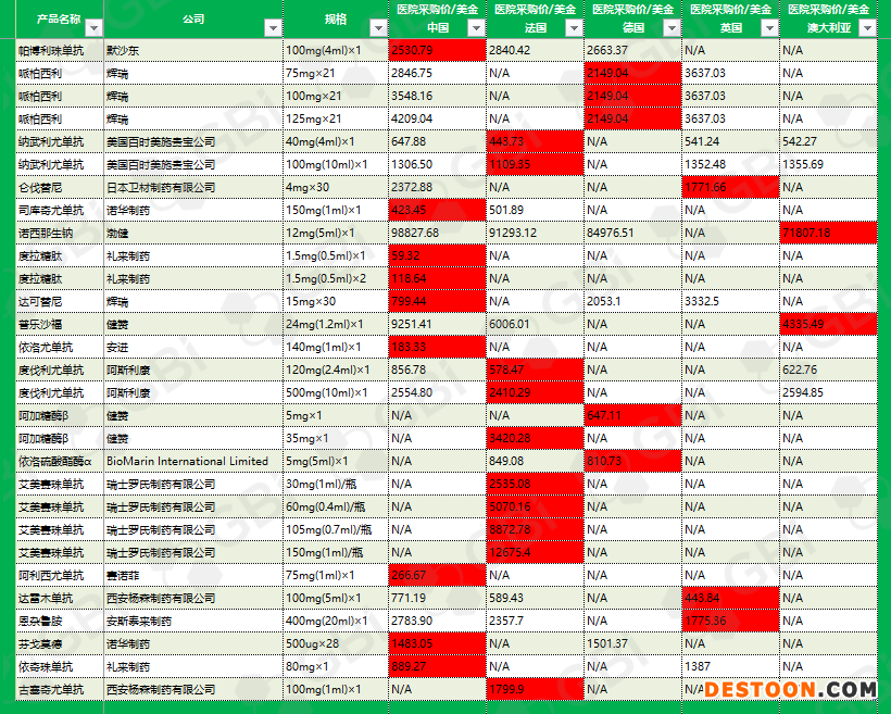 品種之后也附上該品種在中國、法國、德國、英國和澳大利亞的醫(yī)院采購價(jià),紅色部分為最低價(jià)。
