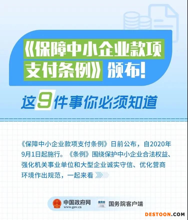據(jù)了解,日前國(guó)務(wù)院發(fā)布《保障中小企業(yè)款項(xiàng)支付條例》(下稱《條例》),自2020年9月1日起施行(文末附圖文解讀,以及企業(yè)規(guī)模自測(cè)方式)。