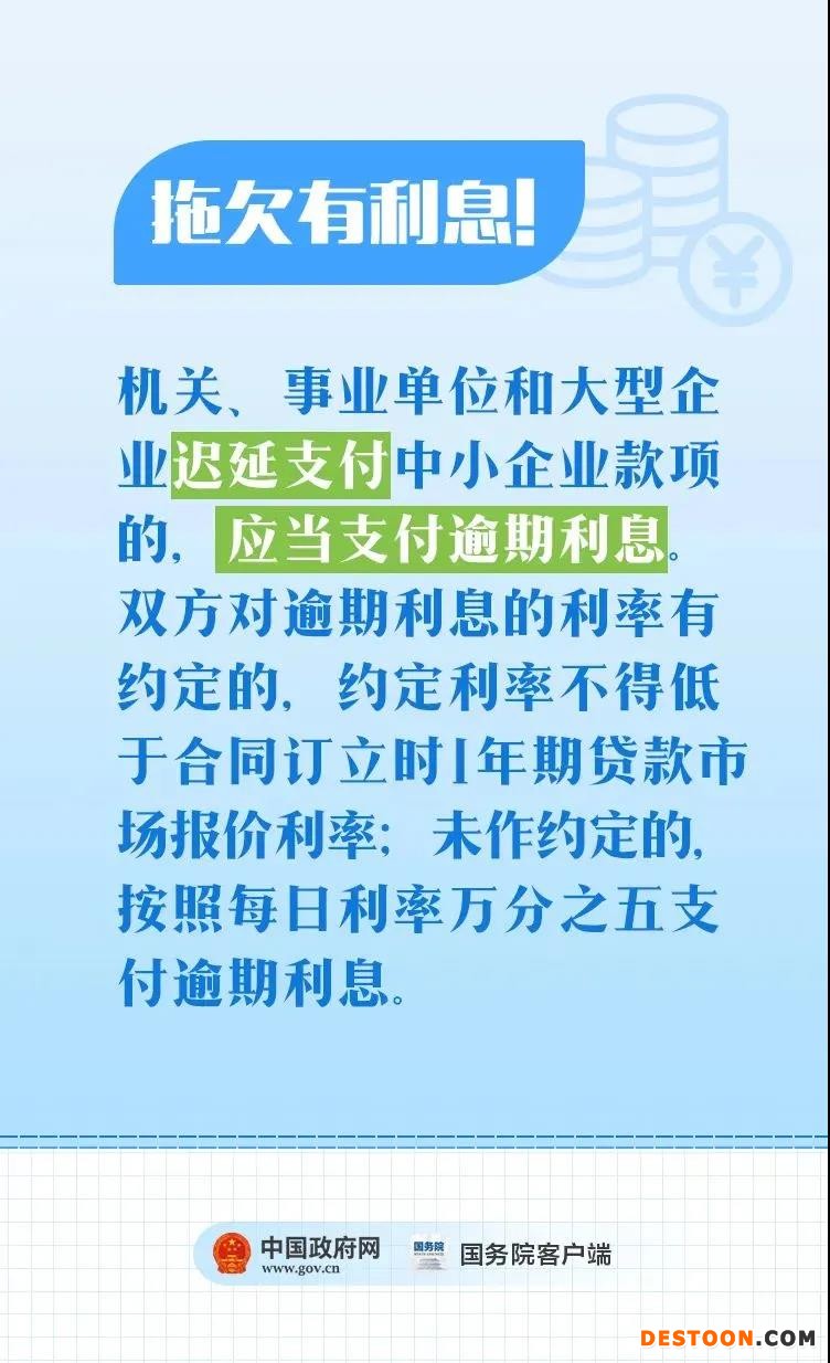 合同約定將檢驗(yàn)或者驗(yàn)收作為付款條件的,上述期限最長(zhǎng)可以延長(zhǎng)30日。對(duì)于遲延支付責(zé)任,《意見(jiàn)》明確,國(guó)家機(jī)關(guān)、事業(yè)單位和大型企業(yè)遲延支付中小企業(yè)款項(xiàng)的,應(yīng)當(dāng)支付逾期利息。