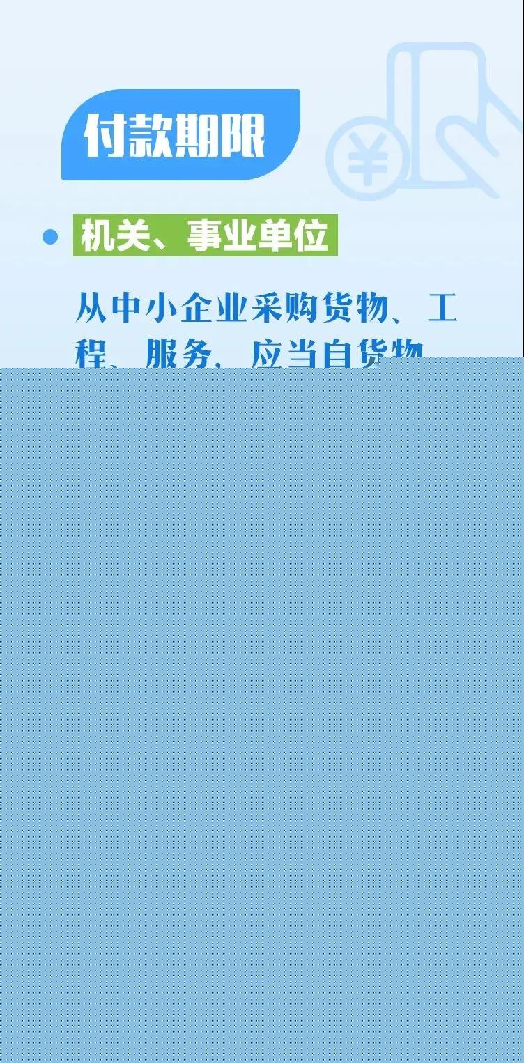 《條例》對(duì)付款期限作出明確規(guī)定,機(jī)關(guān)、事業(yè)單位從中小企業(yè)采購(gòu)貨物、工程、服務(wù),應(yīng)當(dāng)自貨物、工程、服務(wù)交付之日起30日內(nèi)支付款項(xiàng),合同另有約定的,付款期限最長(zhǎng)不得超過(guò)60日。