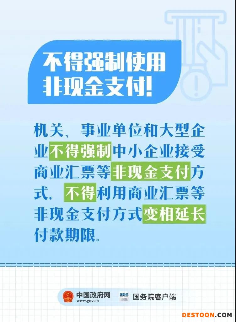 對(duì)此,《條例》強(qiáng)調(diào)禁止變相拖欠貨款,規(guī)定機(jī)關(guān)、事業(yè)單位和大型企業(yè)使用商業(yè)匯票等非現(xiàn)金支付方式支付中小企業(yè)款項(xiàng)的,應(yīng)當(dāng)在合同中作出明確、合理約定,不得強(qiáng)制中小企業(yè)接受商業(yè)匯票等非現(xiàn)金支付方式,不得利用商業(yè)匯票等非現(xiàn)金支付方式變相延長(zhǎng)付款期限。