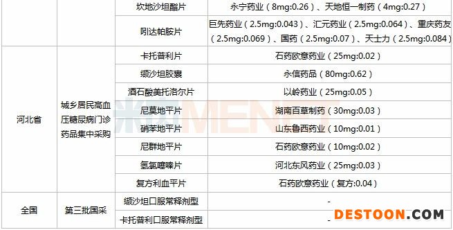 從省級(jí)集采看,河北省開展城鄉(xiāng)居民高血壓糖尿病門診藥品集中采購(gòu),8個(gè)抗高血壓藥納入其中,石藥歐意藥業(yè)有多個(gè)品種中標(biāo);卡托普利、纈沙坦為第三批國(guó)采品種。