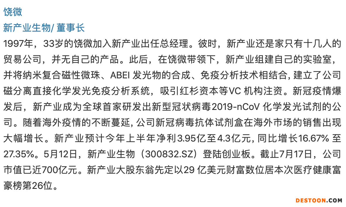 疫情也給醫(yī)療健康行業(yè)的二級市場點(diǎn)了一把火,上半年多家生物醫(yī)藥公司股價(jià)持續(xù)上漲創(chuàng)歷史新高,實(shí)現(xiàn)市值升檔。例如,恒瑞醫(yī)藥股價(jià)創(chuàng)新高,市值跨入5000 億關(guān)口。同時(shí)讓這些公司的創(chuàng)始人和管理團(tuán)隊(duì)身家上浮。(文末附今年涌現(xiàn)出的醫(yī)藥板塊的新晉富豪)