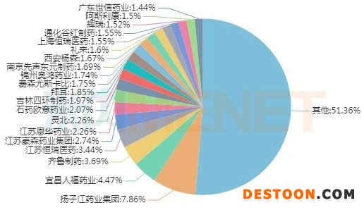 從廠家銷售格局來看,TOP10有8家是國內(nèi)企業(yè),外資企業(yè)僅有靈北和拜耳。而這8家國內(nèi)企業(yè)中有4家是江蘇的明星藥企,分別是揚(yáng)子江藥業(yè)、恒瑞醫(yī)藥、豪森藥業(yè)和恩華藥業(yè),4家合計(jì)市場(chǎng)份額超16%。