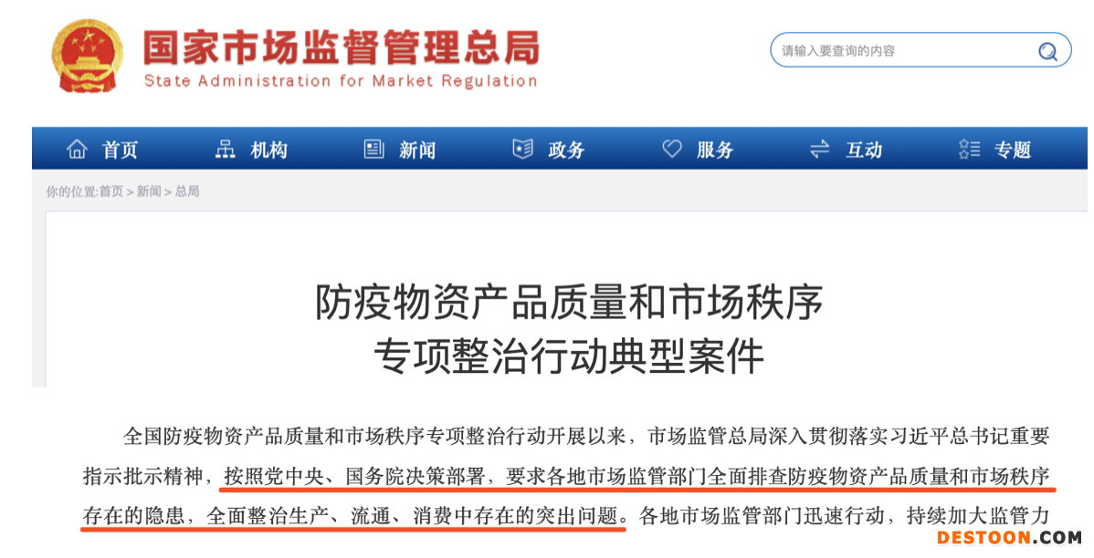 日前,國(guó)家市場(chǎng)監(jiān)督管理總局發(fā)布了《防疫物資產(chǎn)品質(zhì)量和市場(chǎng)秩序?qū)m?xiàng)整治行動(dòng)典型案件》。據(jù)官網(wǎng)披露,國(guó)家要求各地市場(chǎng)監(jiān)管部門(mén)全面排查防疫物資產(chǎn)品質(zhì)量和市場(chǎng)秩序存在的隱患,全面整治生產(chǎn)、流通、消費(fèi)中存在的突出問(wèn)題。