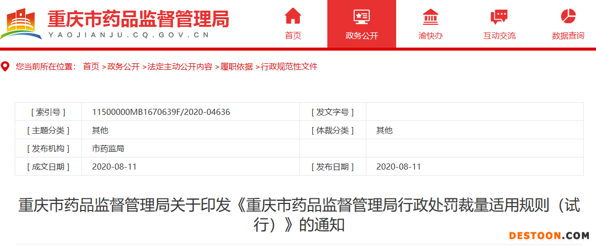 8月13日訊 新的《藥品管理法》實(shí)施后,各地針對(duì)該法陸續(xù)出臺(tái)了行政處罰裁量標(biāo)準(zhǔn)。8月11日,重慶市藥監(jiān)局印發(fā)了《重慶市藥品監(jiān)督管理局行政處罰裁量適用規(guī)則(試行)》(以下簡稱《規(guī)則》)。