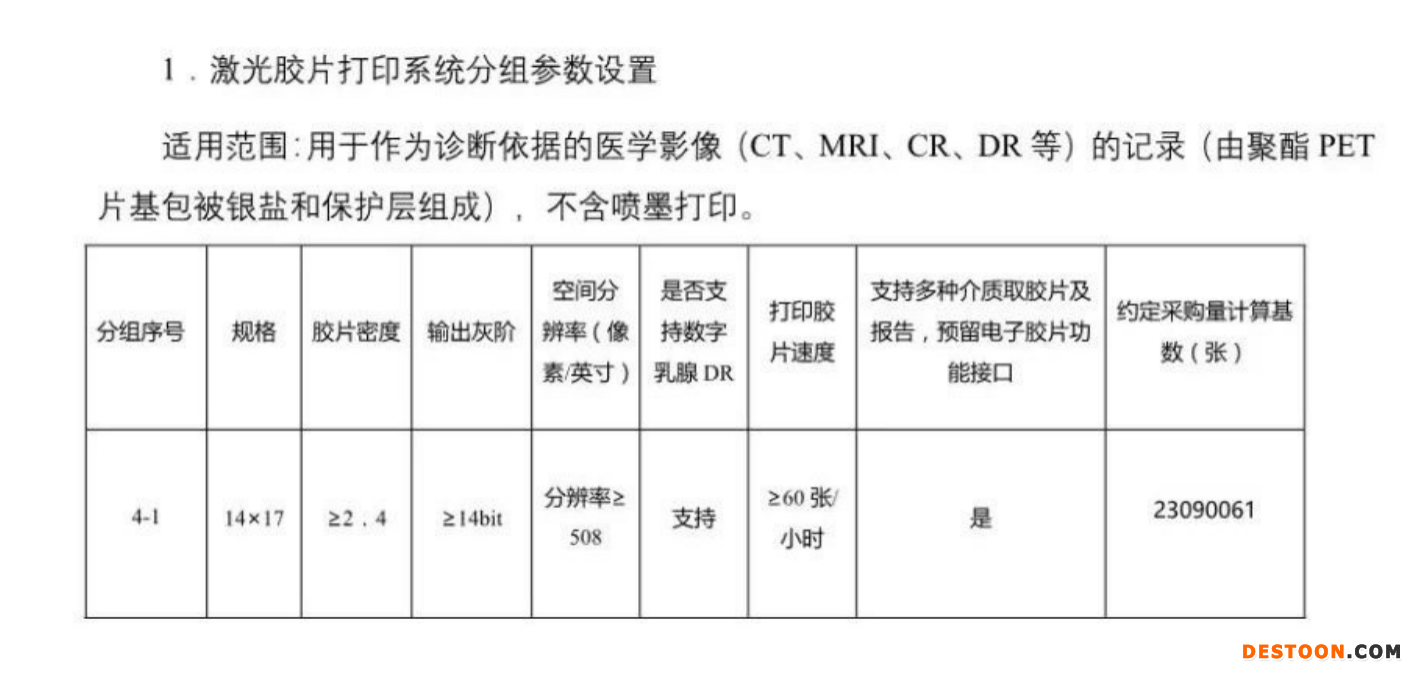 點評:對激光膠片的要求竟有六項之多,這是在以前的招標中前所未有,14*17的膠片是最常用的,CT和MRI必須用14*17的,DR可以用其他尺寸的,比如10*12,8*10。分辨率大于508的醫(yī)用膠片是高端產品,低于508dpi是低端產品。最重要的是含銀的醫(yī)用膠片都是進口的如銳柯,富士4000,柯尼卡,采用干式直熱成像技術,而國產激光膠片主要是采用的激光轉印技術。噴墨膠片因為價格很低對進口膠片的威脅很大,搶占不少進口膠片的市場份額。