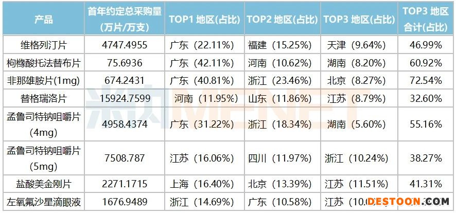 表4:七大產(chǎn)品首年約定采購(gòu)量前三地區(qū)