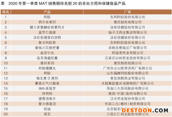 從前20的產(chǎn)品排名(見表)情況來看,按MAT滾動銷售額排序,東阿阿膠生產(chǎn)的阿膠產(chǎn)品位列第一,但增速為負?;菔系拟}爾奇系列和湯臣倍健的健力多氨糖軟骨素鈣片排名分列第二、第三。連花清瘟膠囊增速最高,達79.5%。