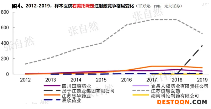 如圖4所示,因“4+7”及擴(kuò)圍中選,揚(yáng)子江的鹽酸右美托咪定注射液的銷量大幅上升,作為光腳者,迅速搶占了未中標(biāo)企業(yè)的市場(chǎng)份額。