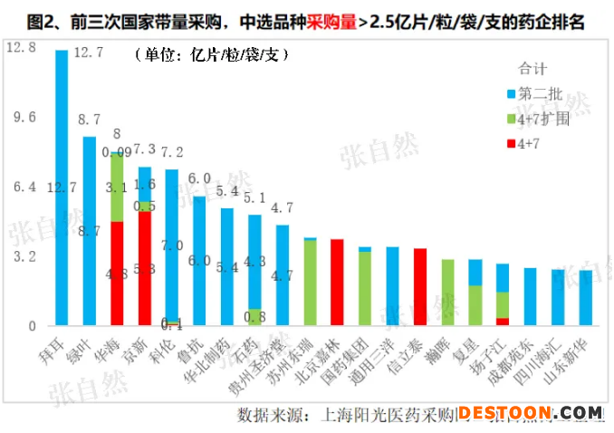前3次國(guó)采,中選品種采購量最大的是德國(guó)拜耳,共12.7億片,其僅靠在第二批中標(biāo)的阿卡波糖即穩(wěn)居榜首,當(dāng)時(shí)該公司以高達(dá)78%的降價(jià)幅度奪魁也成為第二批國(guó)采的最大爆點(diǎn)。阿卡波糖還造就了采購量亞軍四川綠葉,前5家藥企(拜耳、綠葉、華海、京新、科倫)的采購量就占了前3次國(guó)采總采購量的30%。