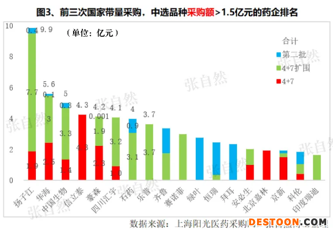 其他中選采購額較大的依次是華海5.6億元、中國(guó)生物制藥(含正大天晴和北京泰德)5億元,位居第4的是深圳信立泰,其僅靠“4+7”中標(biāo)的硫酸氫氯吡格雷片一個(gè)產(chǎn)品,就占了“4+7“總采購額的23%。這前4家藥企的采購額占了前3次國(guó)采總采購額的30%。