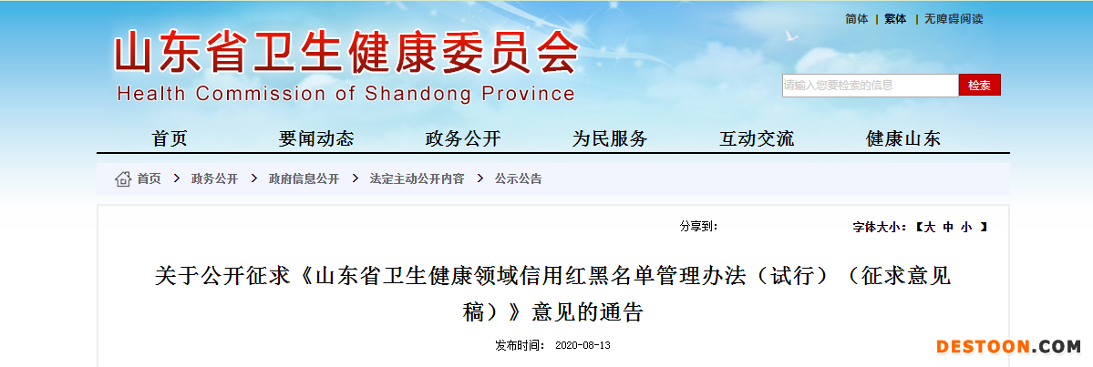 醫(yī)藥網(wǎng)8月21日訊 近日,山東省衛(wèi)生健康委發(fā)布關于公開征求《山東省衛(wèi)生健康領域信用紅黑名單管理辦法(試行)(征求意見稿)》(以下簡稱《征求意見稿》)意見的通告。
