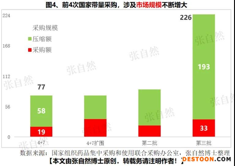 隨著帶量采購進入常態(tài)化,每次國采涉及的市場規(guī)模和擠出的“水分”也越來越大。“4+7”開始試點時涉及的市場規(guī)模只有77億元,實際中標采購規(guī)模只有19億元,初略計算壓縮市場空間約58億元。以后則逐漸增大,第二批國采涉及市場規(guī)模88億元,招標結果實際采購規(guī)模為22億元,壓縮了60多億元。而本次則進一步放大,涉及市場規(guī)模高達226億元,實際采購額僅剩30億元多一點,壓縮了近200億元。當然,采購帶量的市場效應比這些具體數(shù)字還要大得多,國采對市場的擠出效應還將進一步放大。