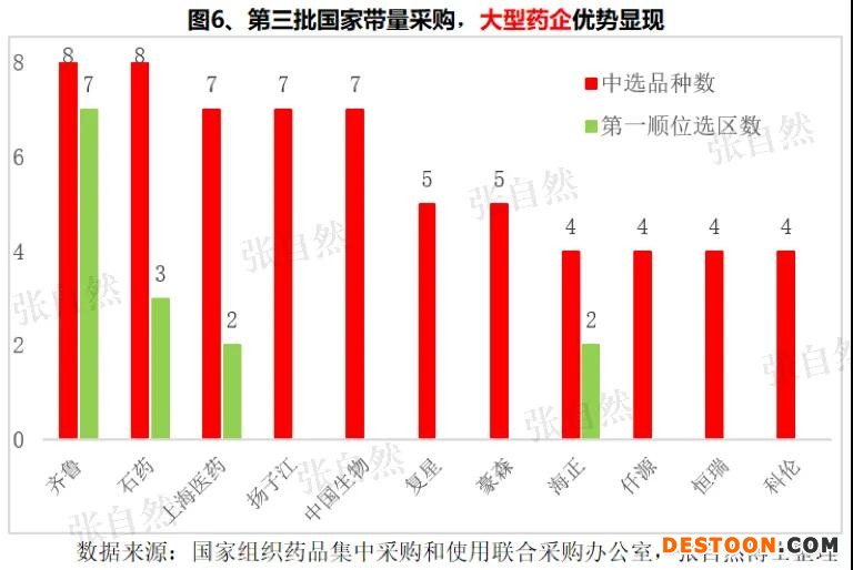 本次國采的另一亮點是頭部企業(yè)表現(xiàn)亮眼,在190多個中選的產(chǎn)品中,有130多個來自百強醫(yī)藥企業(yè),占近7成。其中齊魯、石藥各8個中選,上海醫(yī)藥、揚子江和中國生物制藥都有7個中選。而且在供應區(qū)域優(yōu)先權方面,大型企業(yè)優(yōu)勢更加明顯,如齊魯有7個品種獲得第一順位選擇權,石藥有3個、上海醫(yī)藥有2個。