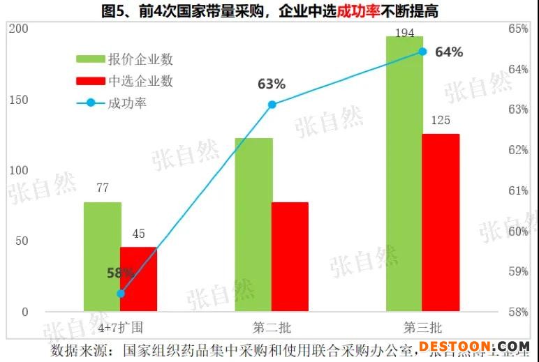 隨著帶量采購以量換價效應的逐漸體現(xiàn)和應采盡采的趨勢,企業(yè)不但對國采的參與度越來越高,而且成功率也不斷提高。主要是投標企業(yè)報價的誠意越來越大,“4+7”擴圍時,實際報價的企業(yè)共有77家,有品種中選的企業(yè)有45家,企業(yè)成功率為58%;第二批國采時有122家報價,有品種中標的達77家,成功率上升到63%;而本次成功率則進一步提升,實際報價的企業(yè)有194家,有品種中選的有125家,成功率又提升了1個百分點,達64.4%。