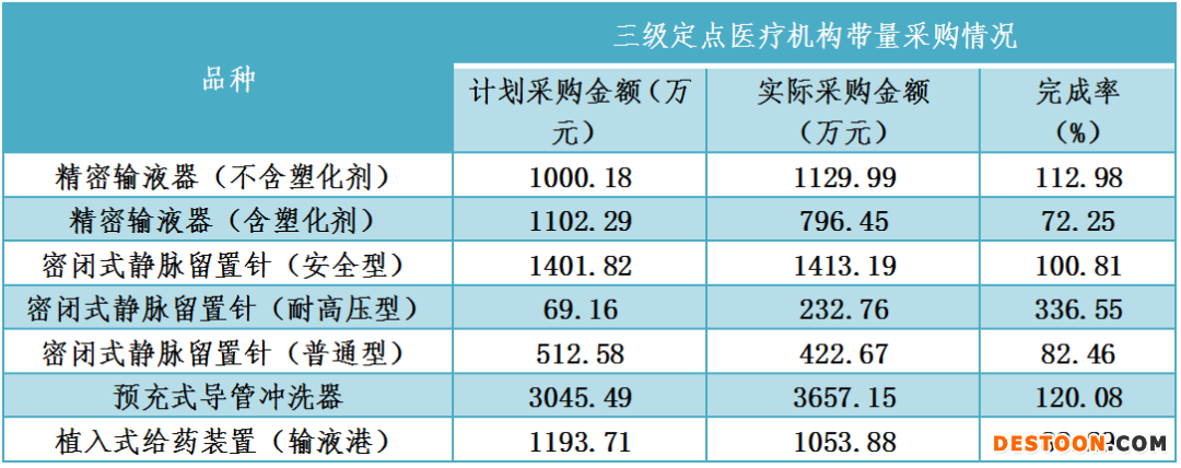 聯(lián)盟帶量采購涉及密閉式靜脈留置針(普通型、安全型、耐高壓型)、精密輸液器(不含塑化劑、含塑化劑)、植入式給藥裝置(輸液港)、預(yù)充式導(dǎo)管沖洗器等4類7個品種,36家定點醫(yī)療機構(gòu)實際采購進度較好,總的完成率達105.8%,超過預(yù)期。