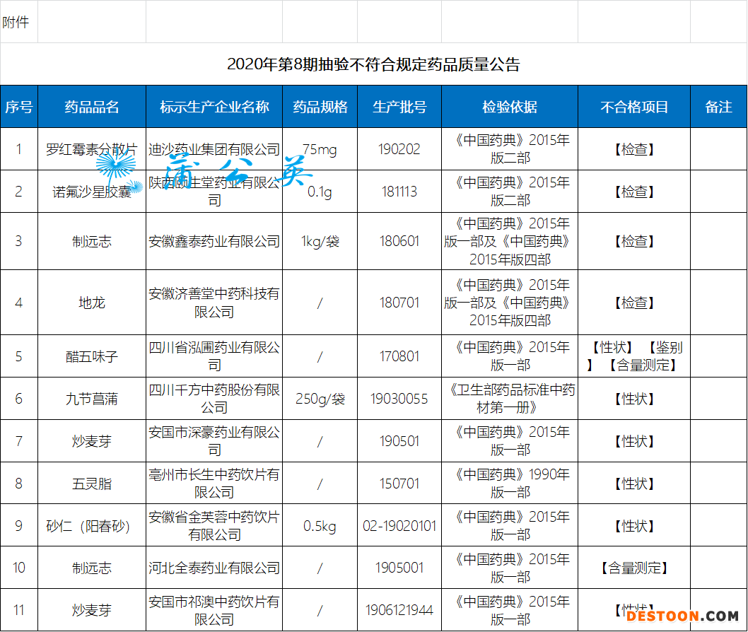 附件:2020年第8期抽驗(yàn)不符合規(guī)定藥品質(zhì)量公告